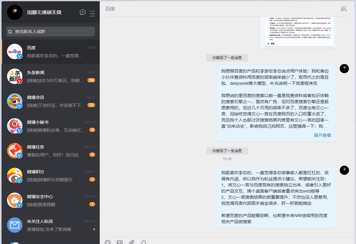 我想跟百度的产品和李彦宏李总说点用户体验:我和身边小伙伴查资料用百度的频率越来越少了,取而代之的是豆包、deepseek等大模型,补充说明一下我是程序员